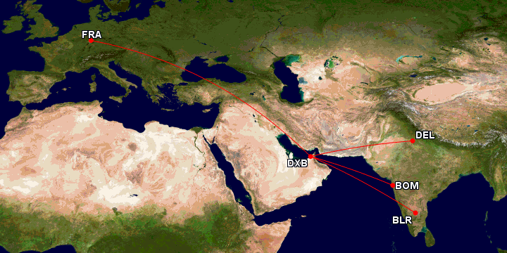 Das Routing von Dubai nach Indien und wieder zurück wurde dabei von der gleichen Besatzung geflogen um eine Ruhezeit vor Ort zu umgehen. Nach diesem Muster wurden die Metropolen Delhi, Mumbai und Bangalore bedient. Nun wurden die Flüge für morgen und die kommenden Tage annulliert, die Operation scheint temporär eingestellt worden zu sein.