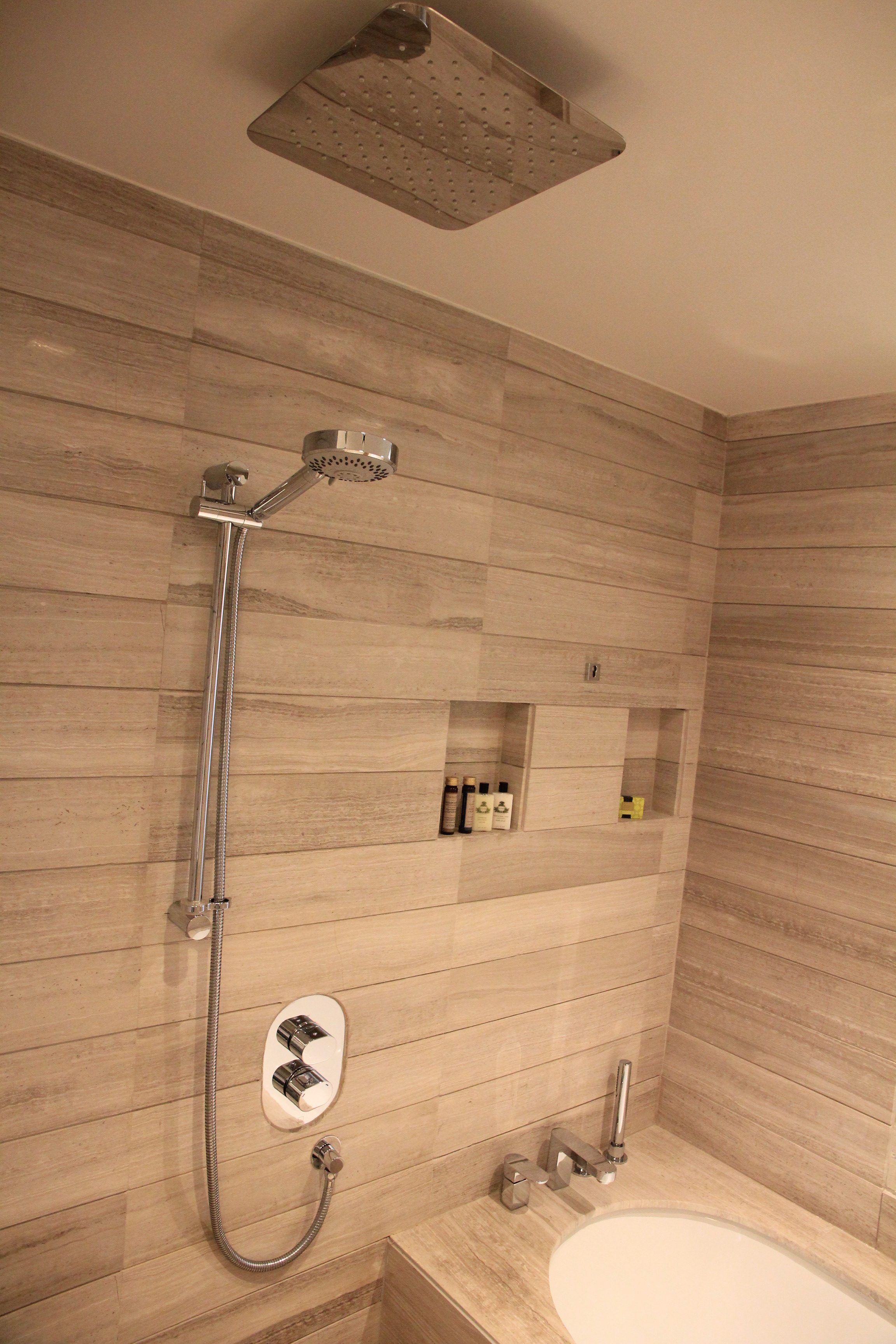 Links daneben befindet sich ein abgetrennter Raum für die Toilette. Rechts befindet sich ein separater Raum in dem die Dusche und die Badewanne verbaut sind. Diese interessante Komposition hatte ich so auch noch nicht. Durch die Milchglaswand ist auch im Bad ein wenig Tageslicht, ohne dass man an Privatsphäre einbüßt. Alles ist mit sandfarbenem Stein verkleidet und wirkt hell, modern und sauber.