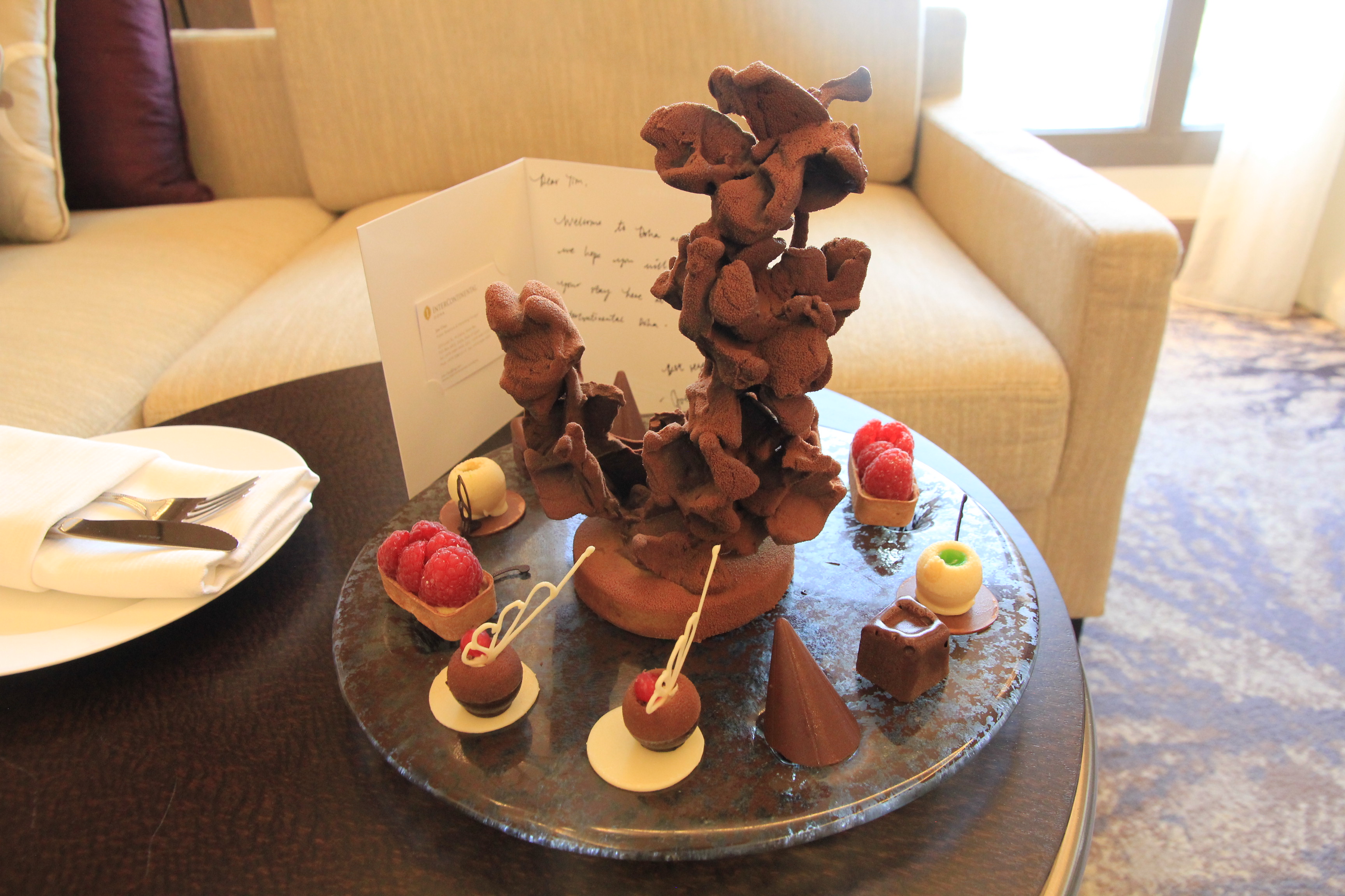 Ich war total vom Willkommensgeschenk überrascht. Neben einem persönlich geschriebenem Brief gab es eine Auswahl von Pralinen mitsamt einer großen Schokoladenskulptur. Leider habe ich das Zimmer erst nach dem Mittagessen betreten, ansonsten hätte ich alles verputzt. So hatte ich leider wenig Appetit, da ich extrem satt war.