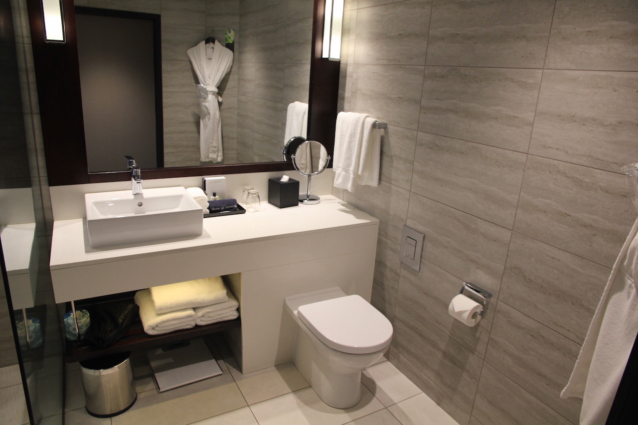 Das Hotel wurde vor zwei Jahren komplett renoviert. Das merkt man auch an den Badezimmern. Alles ist neu und in einem sehr guten Zustand. Die grauen Fließen wirken edel und modern.