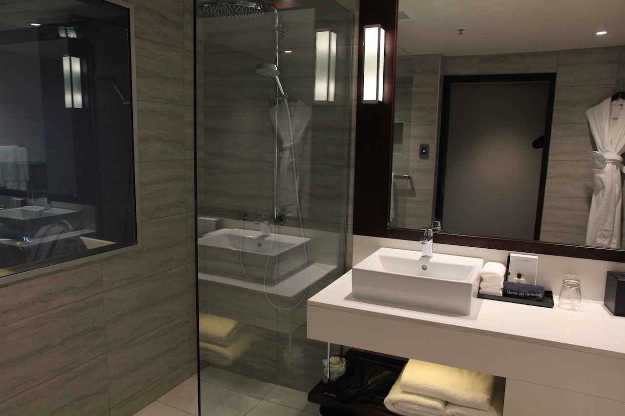 Das Zimmer ist „wie üblich“ aufgeteilt. Rechts vom Eingang befindet sich das Badezimmer. Gerade aus befindet sich ein großer Waschtisch mit einem Waschbecken und viel Ablagefläche. Rechts befindet sich die Toilette und auf der linken Seite eine riesige, begehbare Dusche.