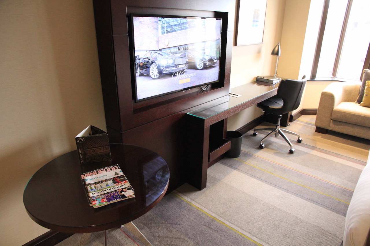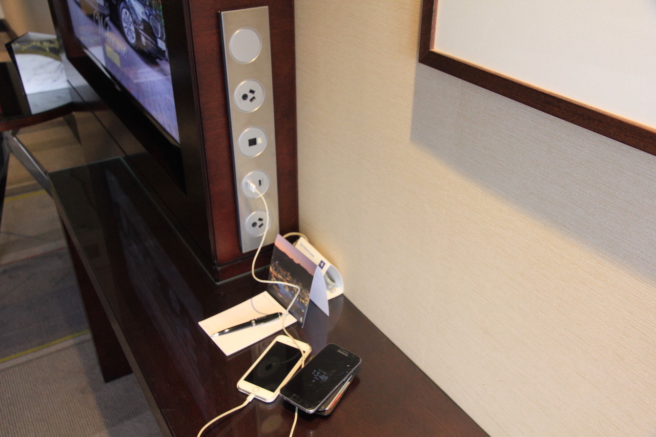 Gegenüber vom Bett befindet sich ein Fernseher sowie ein Schreibtisch. Daneben wiederrum ein kleiner Tisch, den wir als Ablage nutzten. Gut fand ich, dass neben dem Fernseher eine ganze Reihe and Steckdosen und USB Anschlüsse (für den Fernseher) waren. Hier kann man bequem seine Geräte laden.