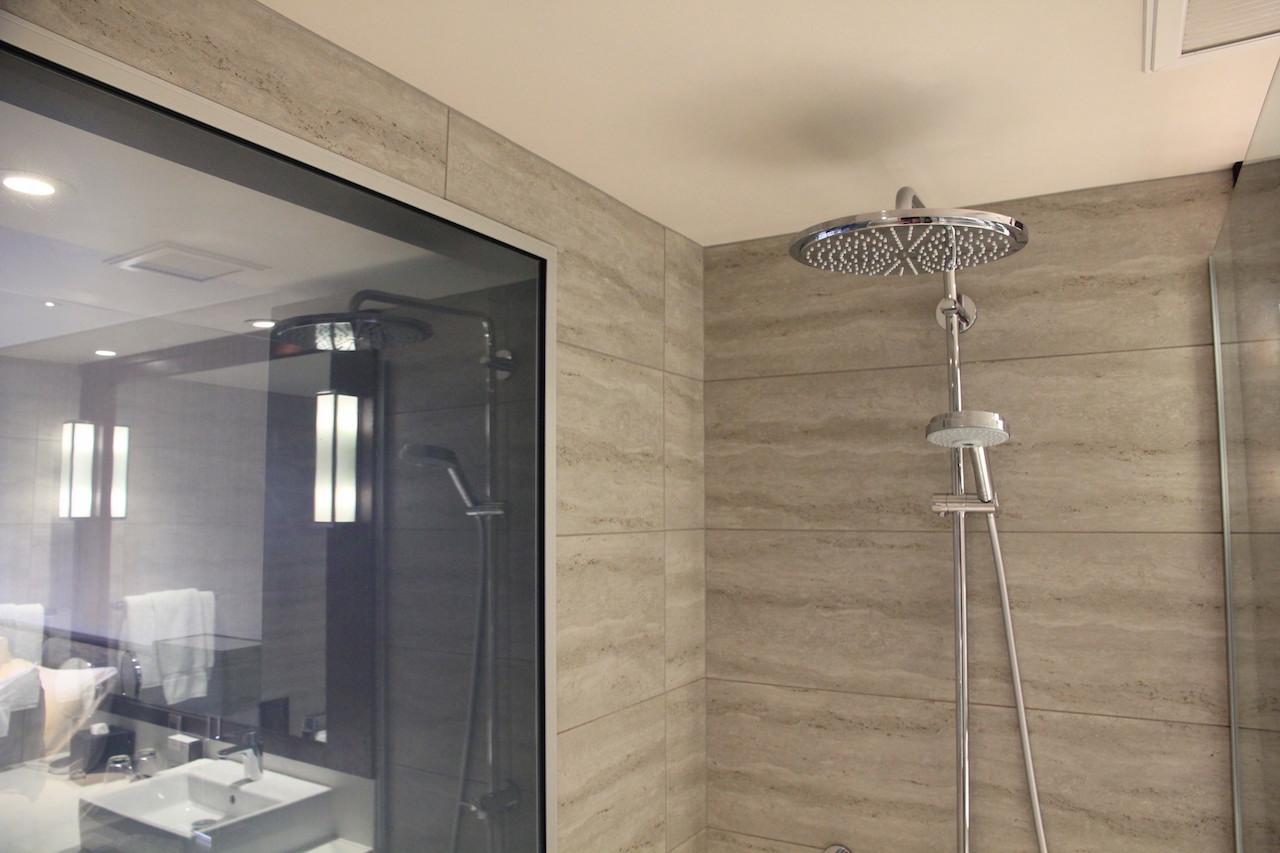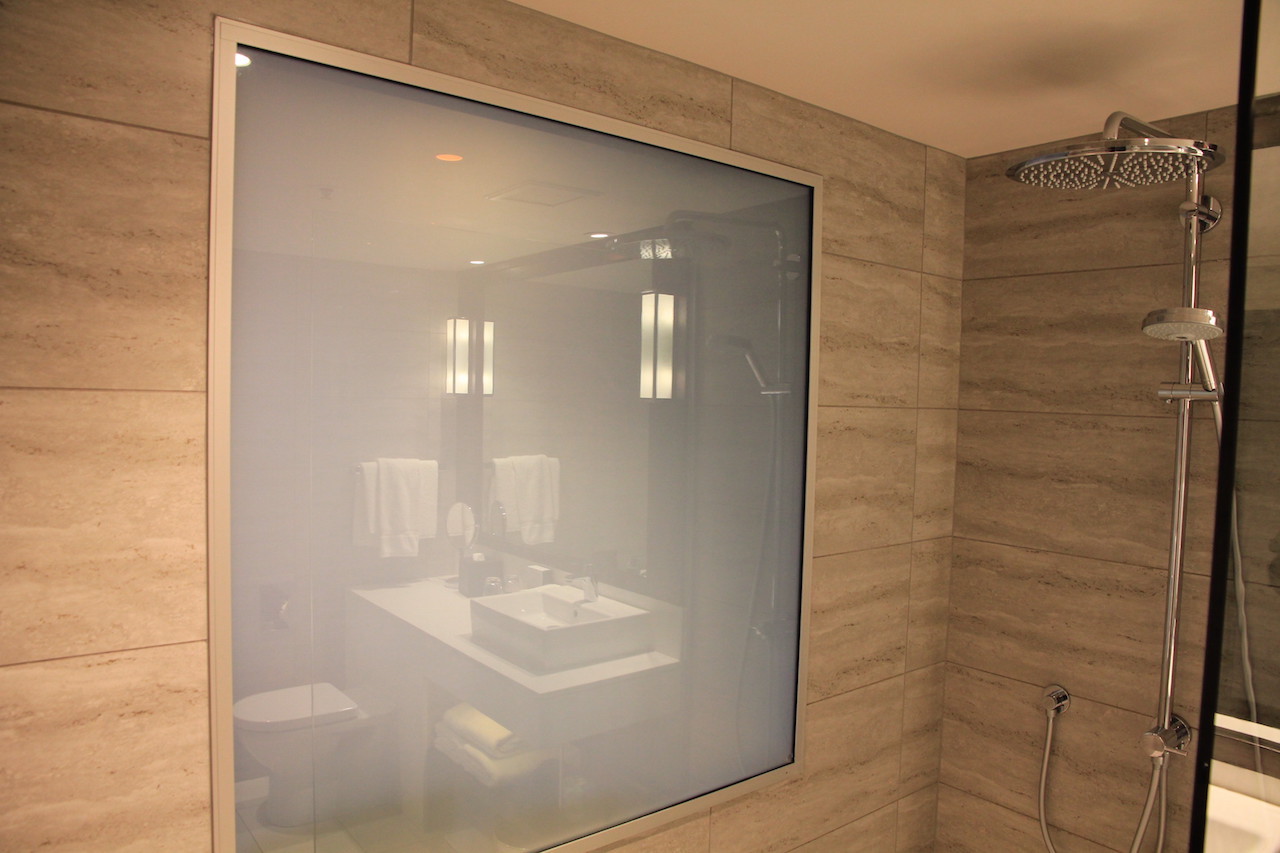 Die Dusche verfügt über eine Glaswand ins Zimmer. Diese lässt sich aber auf Knopfdruck in eine undurchsichtige Wand verwandeln. So hat man seine Privatsphäre wenn man diese benötigt.