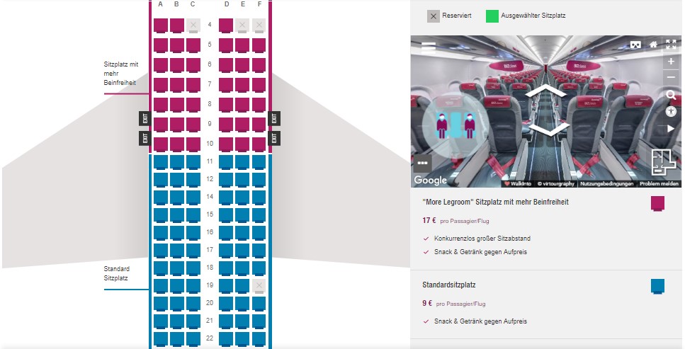 Schritt 4: Sitzplätze variieren nach Reihen und „Kategorie“ also Gang, Fenster, Mitte ist am günstigsten, CI kostenlos wie Schritt 3