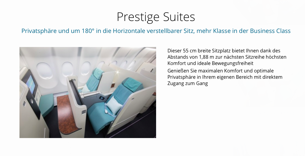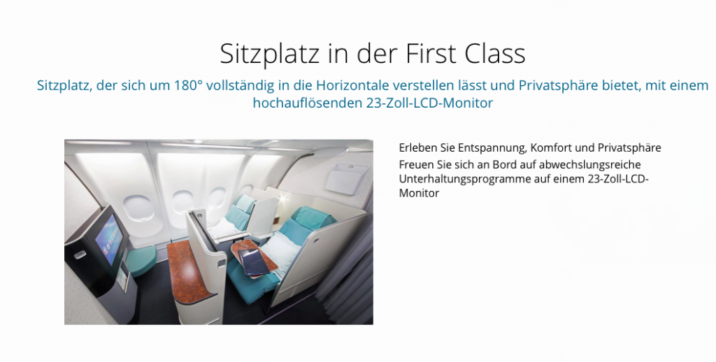Dazu kommt natürlich noch der deutlich aufgewertete Service in der First Class. Allerdings schient es Korean Air durch das lediglich aufgewertete Soft Produkt schwer gefallen zu sein, diese Sitze auch an zahlungskräftige First Class Passagiere zu verkaufen.