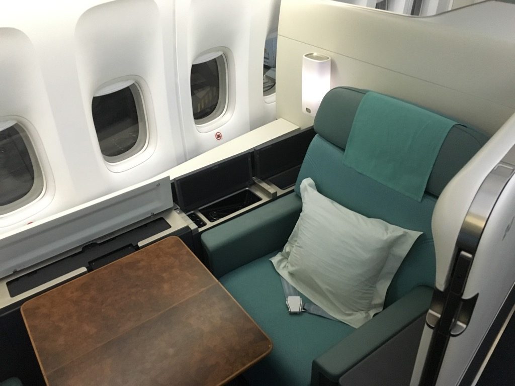 Im Airbus A330 und in der Boeing 787 ist der Unterschied zwischen dem First und Business Class Sitz eher marginal. Hier einmal zum Vergleich Bilder von der First und Business Class in der Korean Air Boeing 787, welche man z.B. nach Barcelona oder Seattle einsetzt.