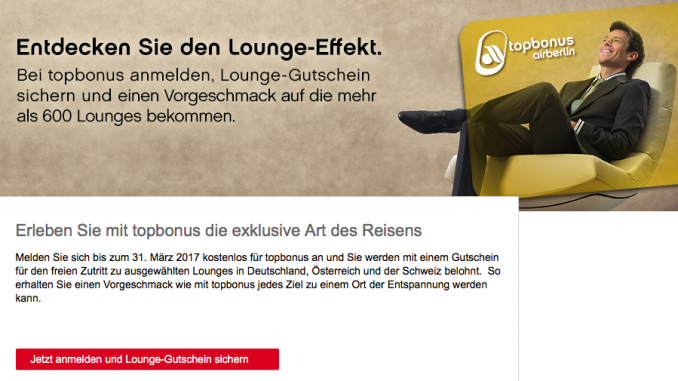 Eines kann man über Air Berlins Vielfliegerprogramm Topbonus wirklich sagen. Sie sind kreativ und bieten fast im Wochenrhythmus neue Promotionen an. Wenn Ihr noch kein Mitglied bei Air Berlin Topbonus seid, erhaltet Ihr momentan nur für die kostenlose Anmeldung bei Topbonus einen Gutschein für einen kostenlosen Loungezugang.