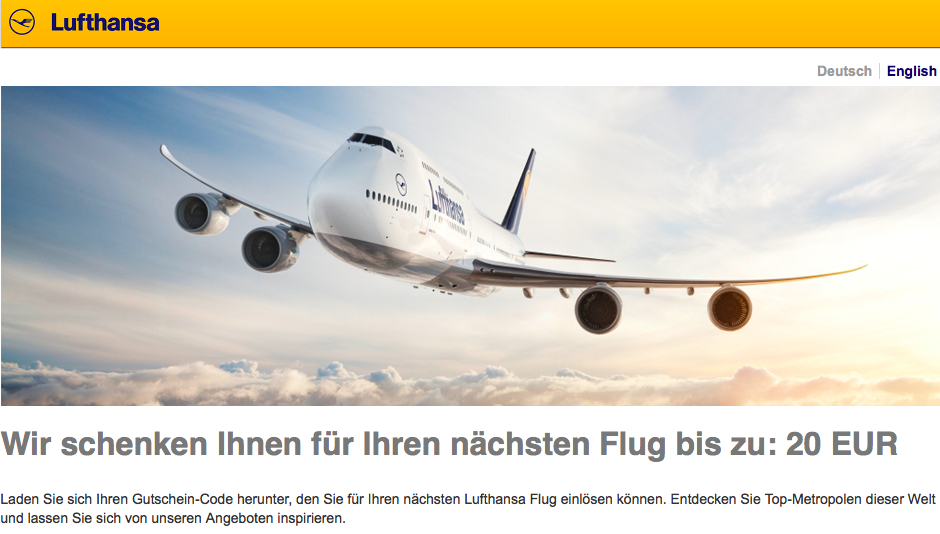 Um den kostelosen 20 Euro Lufthansa Gutschein zu erhallten müsst Ihr nur Euren Namen und Email Adresse auf der Lufthansa Gutscheinseite eintragen. Der Lufthansa Gutschein kommt anschließend per Email.