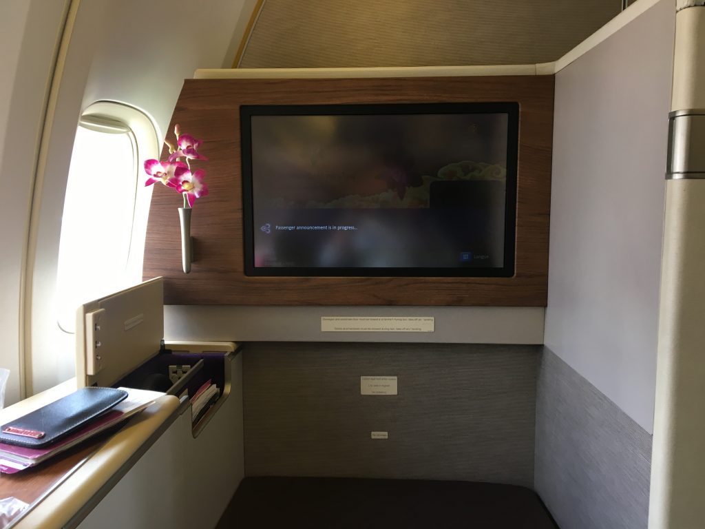 Ich habe mich für 2A, also den Fensterplatz in der zweiten Reihe entschieden. Dieser Platz hat keinen direkten Nachbarn, weshalb er sehr ruhig ist. Der Sitz selbst ist angenehm breit und verfügt über einen Ottomanen, auf welchem auch einen zweite Person während des Fluges Platz nehmen kann. Dazu passend gibt es hier einen sehr großen Tisch, an welchem auch problemlos zwei Personen essen könne. Am Tisch erkennt man auch, dass der Thai First Class Sitz in der Boeing 747 technisch das selbe Model, wie der Swiss First Class Sitz im Airbus A330 ist.
