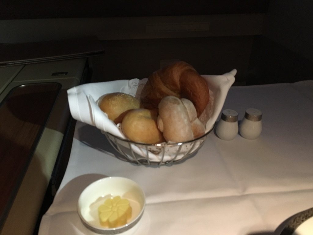 1:10 Stunden vor der Landung in Seoul bin ich aufgewacht. Man fragte mich sofort, ob ich frühstücken wolle. Ich habe mich für das westliche Frühstück entschieden. Als Vorspeise wurde ein Obstteller serviert, sowie ein reichhaltiger Brotkorb, samt Butter und Marmeladen.