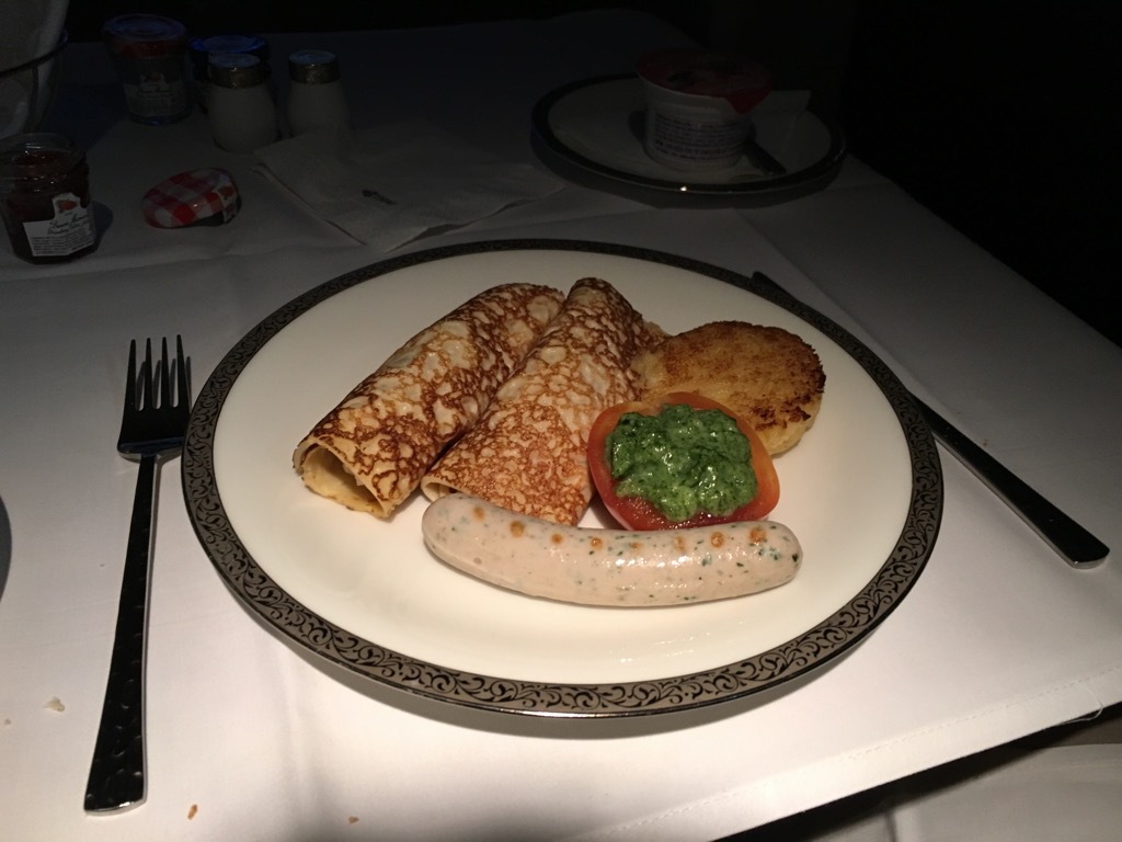 Die Hauptspeise bestand aus mit Rührei gefüllten Crepes, einem Hühnchenwürstchen, Grilltomate mit Spinat und einem Hash Brown. Alles war gut.