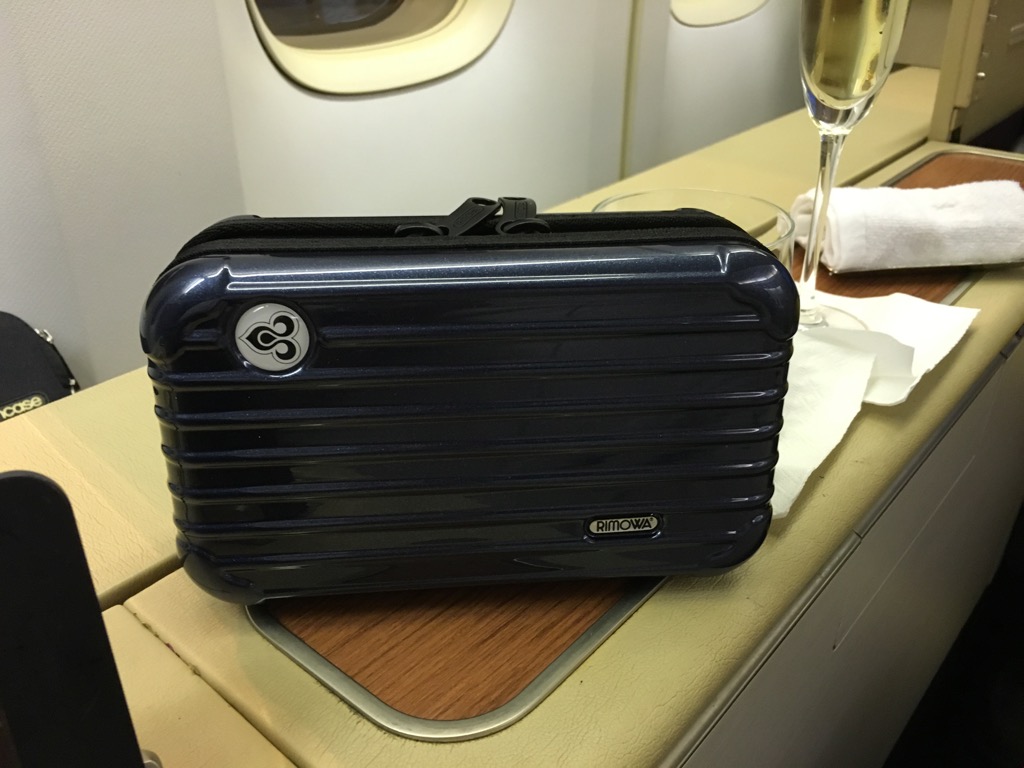 Auch wurde bereits am Boden das Amenity Kit verteilt. Ich freute mich sehr, dass es ein kleines Rimowa Kit mit recht umfangreichem Inhalt gab.