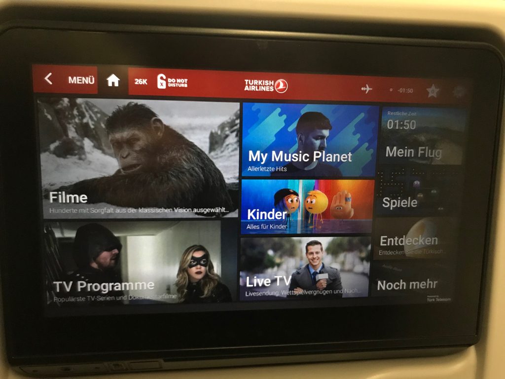 An jedem Sitz bietet Turkish Airlines ihr umfangreiches Inflight-Entertainment-System an, das auch in deutscher Sprache über zahlreiche Filme, Serien und zudem über eine große Musik-Mediathek verfügt.