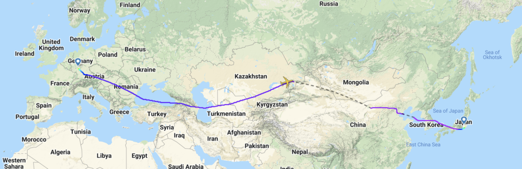 Der Lufthansa Linienflug LH 716 von Frankfurt nach Tokio ist mit einer Reisezeit von 11:35 Stunden im Fluglan der Gesellschaft. Doch dieser kann derzeit nicht eingehalten werden, denn die Berechnung basiert auf der regulären Route, die über Russland führt. Ein Überflug wird jedoch wegen dem Ukraine-Krieg ausgesetzt, die Airlines umfliegen die beiden Länder auf den Strecken zwischen Europa und Asien.