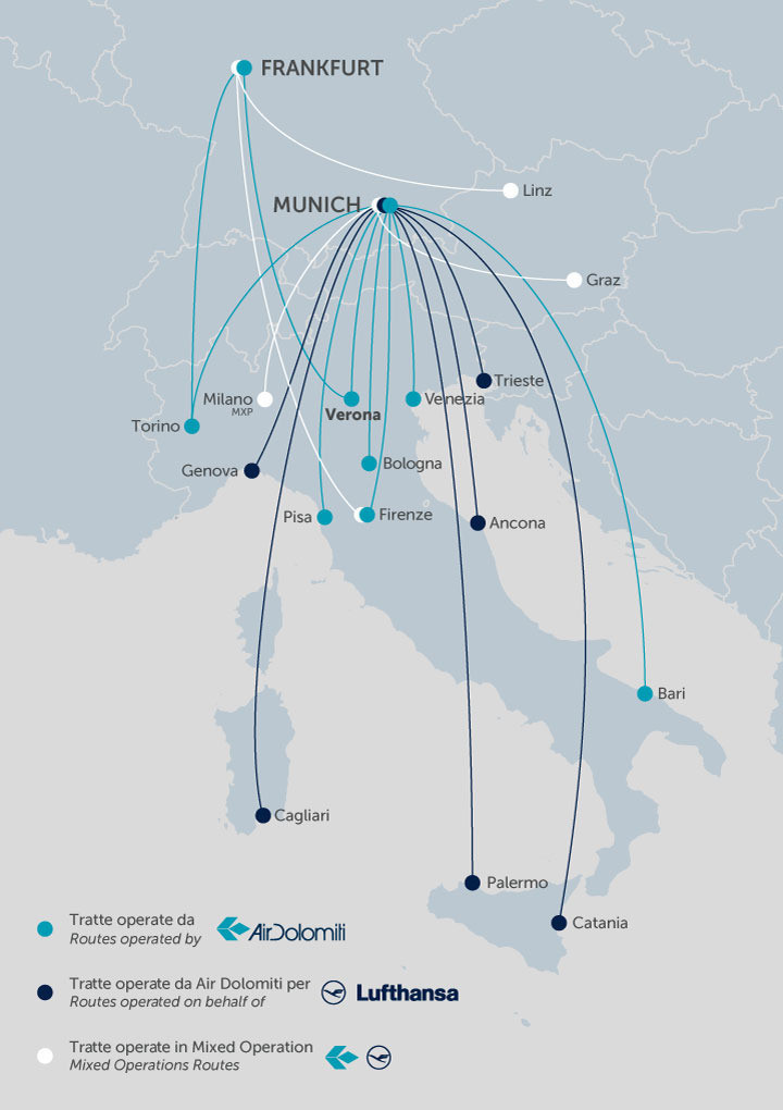 Nachdem besonders die Passagiere außerhalb von Rom und Mailand meist sowieso eine Umsteigeverbindung buchen müssen, bietet Lufthansa mit Air Dolomiti den Kunden in Italien eine „italienische“ Alternative, zumindest bis zum Drehkreuz nach München, von welchem es mit Lufthansa weiter geht.