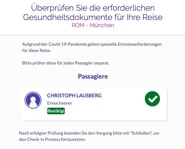 Wir konnten diese digitale Dokumentenprüfung auch schon auf Flügen nach Italien testen und haben hier vor allen Flügen online eine Bordkarte erhalten. Entscheidend ist allerdings, dass man auch die entsprechenden Dokumente wie Impfzertifikat oder einen Test von Centogene mit QR Code besitzt, damit das System die Tests überprüfen kann. Trotz Prüfung müssen diese Dokumente übrigens dennoch mitgeführt werden.