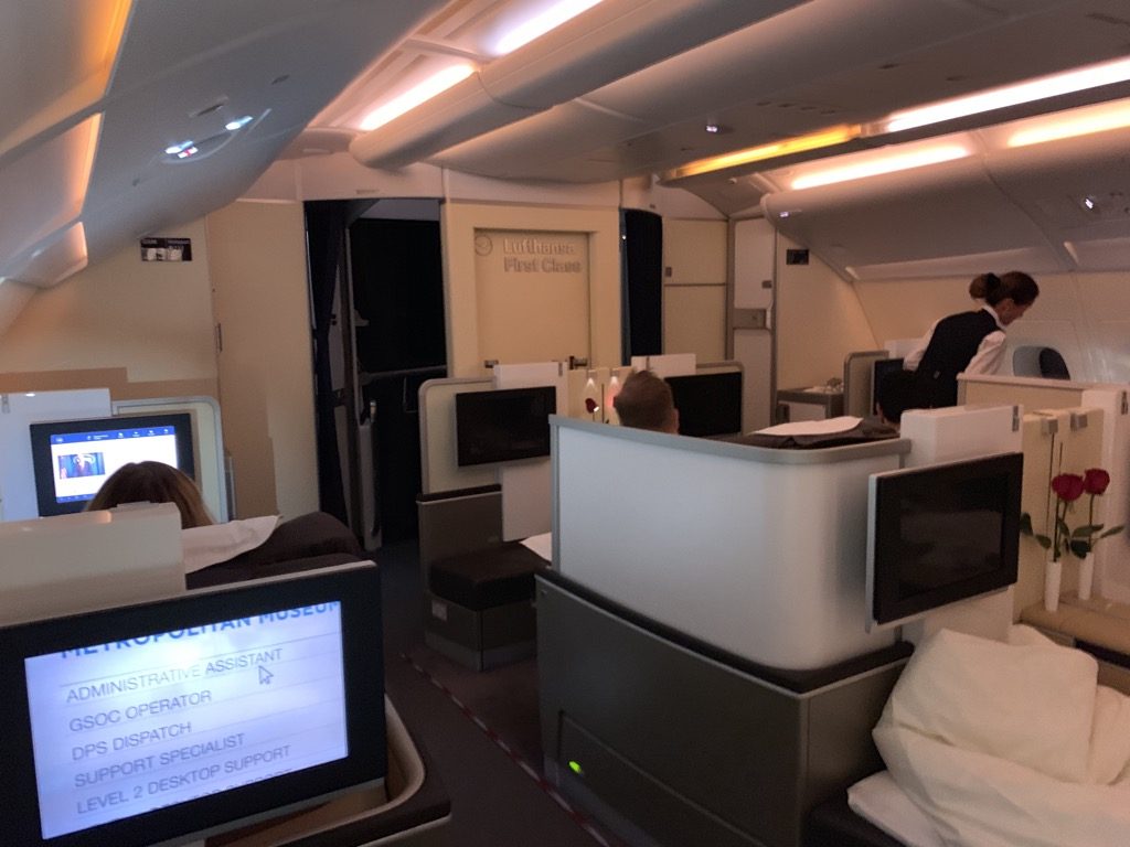 Aktuell bietet Lufthansa die First in drei Flugzeugtypen an: im Oberdeck des A380, im Unterdeck der Boeing 747-8i und im A340-600. Dabei umfasst die First Class immer acht Plätze, die in den Modellen von Airbus in einer 1-2-1 Konfiguration eingerichtet sind. In der Nase des Jumbos sieht es etwas anders aus. Insgesamt ist die First Class Kabine innerhalb der Flotte recht einheitlich.