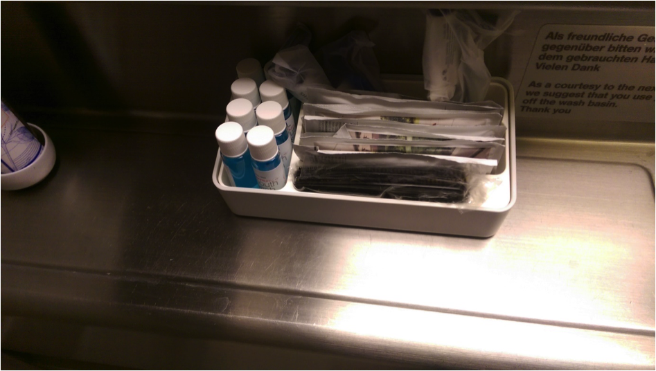 Ebenso waren die Kopfhörer in den vorgesehenen Staufächern zu finden und auch die Einwegrasierer und sonstigen Amenities standen in der Toilette – ganz so, als wäre man Interkontinental unterwegs.