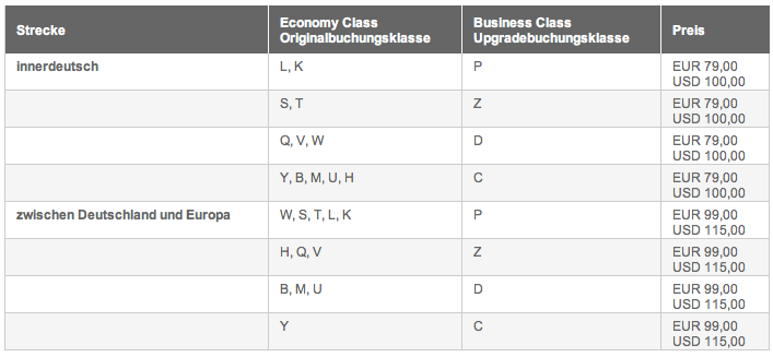 Hinweis, Stand Nov 2017: Die Tabelle ist seit ein paar Wochen von der Info-Seite verschwunden und auch die Verfügbarkeit der Upgrades hat stark gelitten. Die Verfügbarkeit scheint inzwischen auch nicht mehr direkt von der Tabelle abhängig zu sein. Ich hatte jetzt schon mehrfach innerdeutsche Y oder B-Buchungen, die trotz Verfügbarkeit in J+C+D+Z nicht upgradebar waren (Buchung war ohne Special Meal und außerhalb der 4h Frist). Seit 2016 hatte ich die Cash Upgrades vorher sehr häufig genutzt. Schade drum!