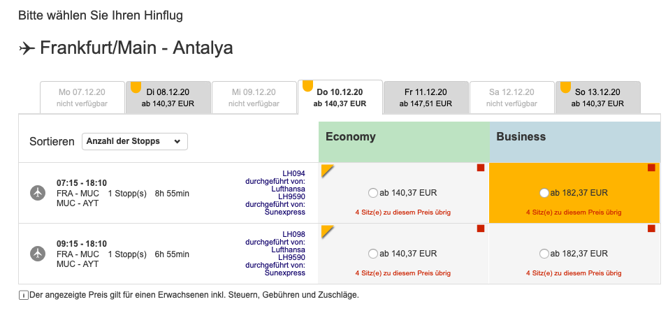 Übrigens müsst Ihr bei der Buchung eines Business Class Tickets, wie im Beispiel oben gezeigt, darauf achten, dass nur der Lufthansa Flug innerhalb Deutschlands in der Business Class stattfindet. SunExpress bietet keine Business Class an und entsprechend hat man auf dem längeren Flug keinerlei Vorteile.