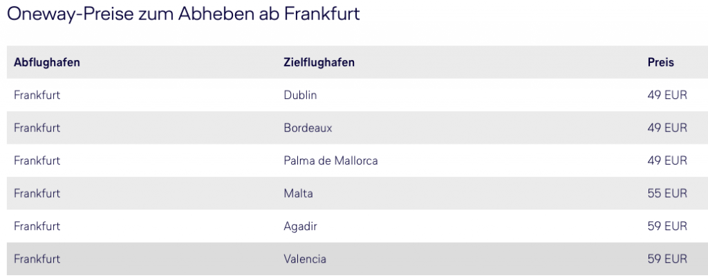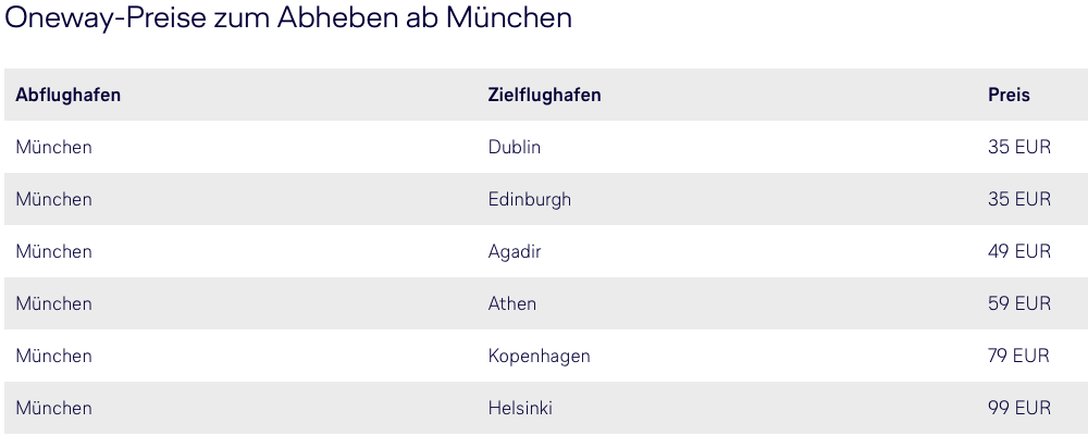 Auf der Lufthansa Angebotsseite lassen sich Flüge zu vielen Zielen in Europa finden. Besonders günstig sind allerdings folgende Flüge, welche sich auch als Oneway sehr günstig buchen lassen.