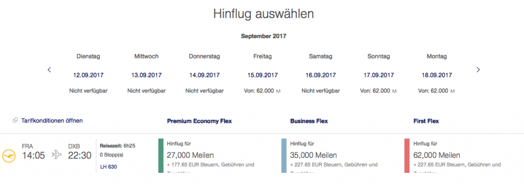 Ein Prämienflug nach Dubai in der First Class kostet mit Miles&More Meilen 62.000 Meilen und ca. 200 Euro an Steuern und Gebühren. Wer Senator oder HON Circle Member ist, kann für ein zweites Ticket noch einmal 50% der Meilen sparen, durch Nutzung des Companion Awards.