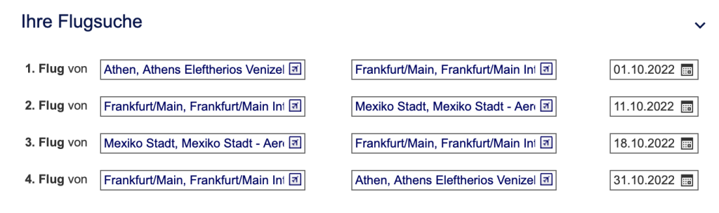 Die maximale Ausbeute, welchen eine die Lufthansa Webseite direkt anbietet ist ein Routing von Athen über Zürich und Frankfurt nach Mexico City. Hier werden folgende Meilenwerte gutgeschrieben, wenn man den Executive Bonus mit einberechnet.
