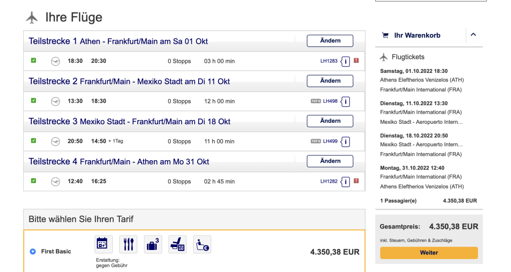 Die Differenz von etwa 100 Euro bei dem Flug mit vier Stop Over, im Vergleich zum direkt durchgeflogenen First Class Tarif von Athen nach Mexiko, resultiert aus zusätzlich anfallenden Steuern, durch die Stop Over. Diesen Aufpreis muss man leider zahlen, wenn man den massiven zusätzlichen Komfort der Stop Over haben möchte.