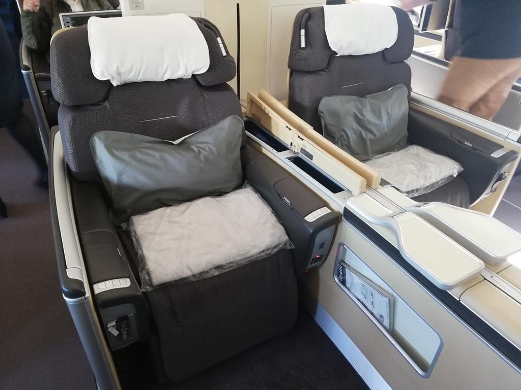 Die acht First Class Sitze sind in drei Reihen angeordnet und es gibt neben dem Sitzpaar in Reihe drei noch sechs Einzelsitze entlang des Fensters.
