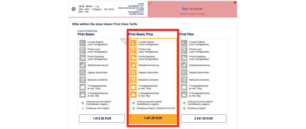 Grundsätzlich lassen sich diese Tarife sehr einfach auf der Lufthansa Webseite finden und buchen, aber man muss darauf achten, dass man die „First Basic Plus“ Tarife auswählt, da nur diese diesen Preis liefern.