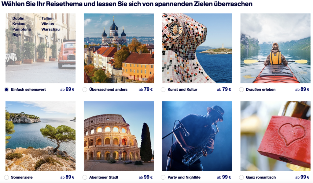 In jedem Fall muss man flexibel sein, auch wenn man sich auf eine Kategorie beschränkt. So kann es bei „Draußen erleben“ zu entfernteren Zielen wie an die Algarve oder nach Zypern gehen, es kann aber genauso gut Genf werden. Einzelne Destinationen kann man gegen Aufpreis ausschließen, vereinzelt geht’s auch ohne Gebühr.