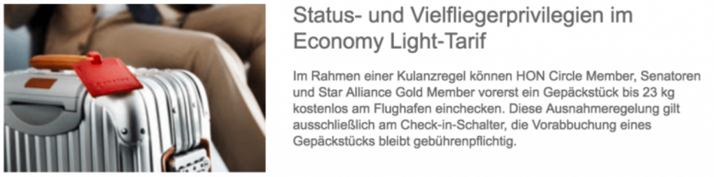 Hieraus scheint man bei Lufthansa gelernt zu haben, denn man wird Vielfliegern mit HON Circle, Senator und Star Alliance Gold, im Light Tarif auf Langstrecke, ein kostenloses Gepäckstück erlauben. Dies wird von Lufthansa als „Kulanzregelung“ bezeichnet, was die Vermutung aufwirft, dass diese Regelung zeitlich begrenzt ist. Auch gibt es ein kostenloses Gepäckstück nur, wenn man am Flughafen am Schalter eincheckt. Hier kann der Mitarbeiter die Gepäckgebühr erlassen.