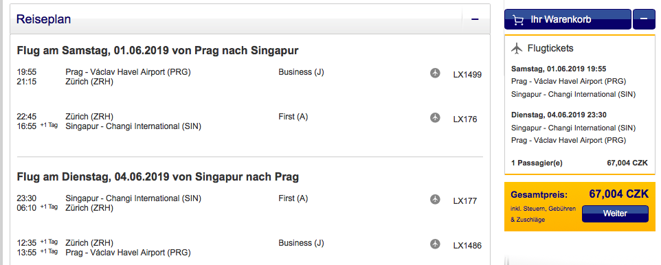 Ein Hin- und Rückflug mit der Swiss von Prag über Zürich nach Singapur in der First Class kostet aktuell 2.605 Euro. Hiermit sammelt man direkt 46.632 HON Circle-/ Status Meilen, wenn man mindestens den Frequent Traveller Status inne hat.