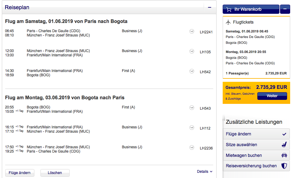 Alternativ kann man auch nach Südamerika in der Lufthansa First Class fliegen. So kostet ein Flug von Paris nach Bogota in der Lufthansa First Class etwa 2.700 Euro.
