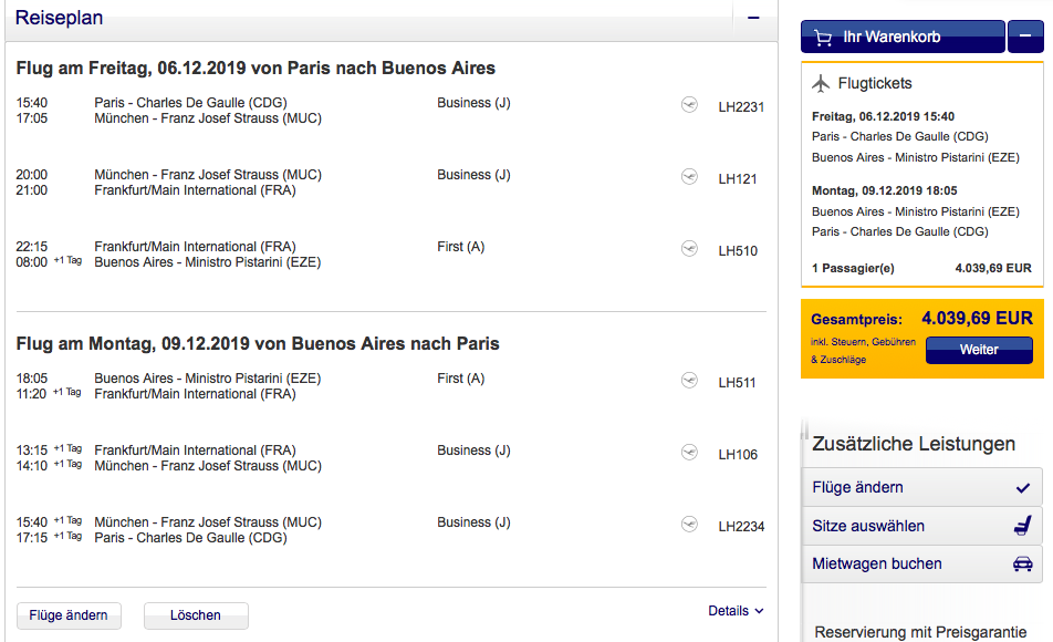 Wer besonders viele Meilen auf einen Schlag sammeln möchte, der kann von Paris über München und Frankfurt auf dem längsten Lufthansa Flug nach Buenos Aires fliegen. Hier müsst Ihr zwar schon etwas über 4.000 Euro investieren, allerdings sammelt Ihr mit nur einem Trip (zur Not an einem Wochenende) 55.114 HON Circle/ Status Meilen.