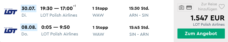 Ab Stockholm bietet LOT auf ihrem sehr langen Flug nach Singapur momentan Business Class Tarife an, mit welchen man für 1.547 Euro einen Hin- und Rückflug nach Singapur buchen kann.