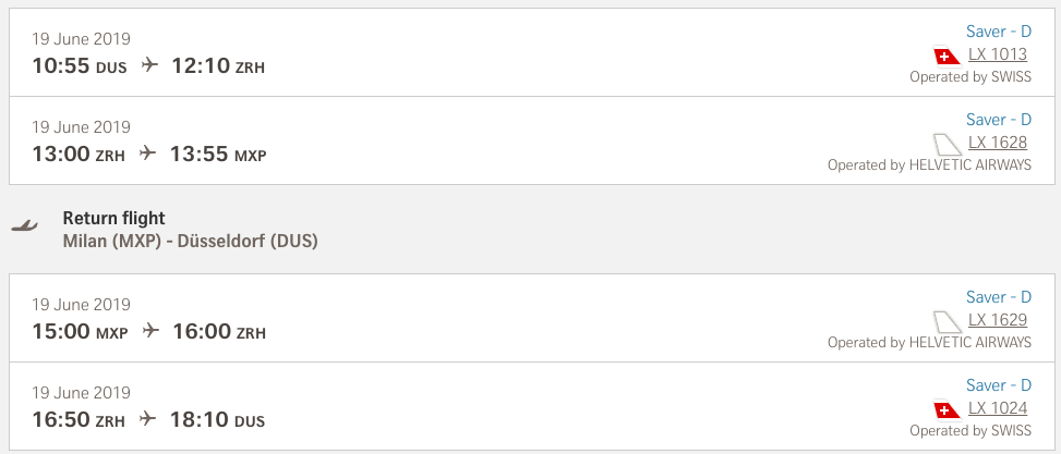 Wenn Euch nur noch wenig Meilen für die Statusverlängerung fehlen, bietet sich der Klassiker von Düsseldorf über Zürich nach Mailand mit der Swiss an. Wenn Ihr einen Sameday Return in der Business Class bucht, landet Ihr mindestens in der Buchungsklasse D.