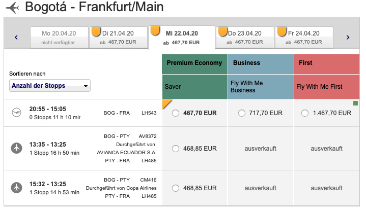 Die Angebote in der Premium Economy Class haben aber den großen Vorteil, dass Ihr sie ganz einfach über die Lufthansa Webseite mit den Business Class Partnerangeboten oder auch den First Class Angeboten kombinieren könnt. Hierbei könnt Ihr tolle Reisen bauen, wie zum Beispiel nach Bogota für etwa 1.100 Euro mit Hinflug in der Premium Economy Class (Tagflug) und einem Rückflug in der Business Class (Nachtflug).