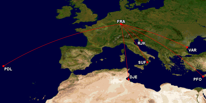 Neu ab Frankfurt sind Paphos auf Zypern, Rijeka in Kroatien, Lamezia Terme in Kalabrien, Djerba in Tunesien und Varna an der bulgarischen Schwarzmeerküste. Die Ziele werden mit Maschinen der Airbus A320-Familie geflogen, damit erreicht man auch die Azoren. Mit dem neuen Flug nach Ponta Delgada kommt die Inselgruppe im Atlantik ebenfalls neu in das LH-Netz.