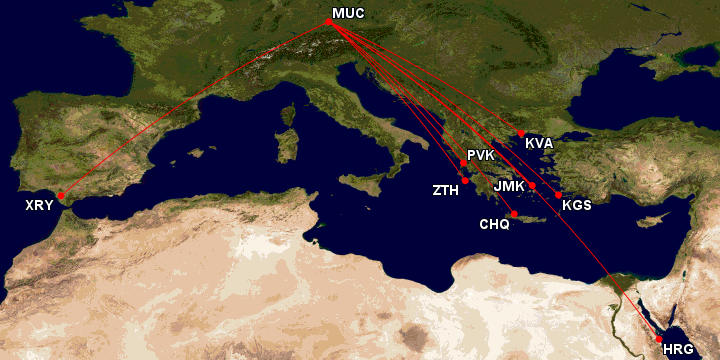 Ab München liegt der Schwerpunkt ganz klar auf Griechenland, dort befinden sich auch die meisten neuen Ziele. Ferner werden Reisen nach Chania, Mykonos, Kos, Kavalla, Zakynthos und Preveza angeboten. Zum ersten Mal geht es auch nach Jerez de la Frontera in Spanien, neu im Sommer ist Hurghada in Ägypen.