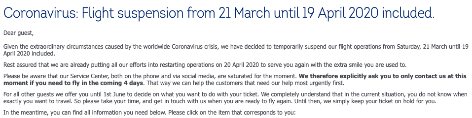 Brussels Airlines bittet Passagiere auf ihrer Webseite darum, nur die Airline zu kontaktieren, wenn sie in den kommende vier Tagen, bis zum Einstellen des Flugbetriebes reisen möchten, da die Callcenter aufgrund des hohen Aufkommens absolut überlastet sind.