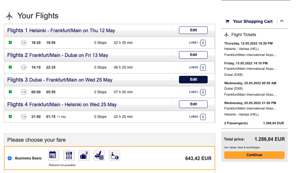 Der Trick, wie man die Lufthansa Seite dazu bewegt, doch diese Tarife einzubuchen ist denkbar einfach, aber auch etwas umständlich. Man muss „einfach“ die Married Segments trennen und dann noch dem recht dummen System der Lufthansa Webseite erklären, dass man den Partnertarif ab Helsinki buchen will.