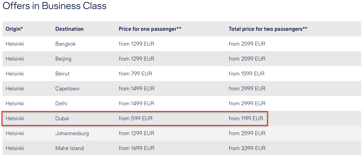 Lufthansa hat gerade einen weltweiten Sale am laufen und besonders ab Finnland sticht ein Business Class Partnerangebot heraus. Dubai mit 599 Euro für den Hin- und Rückflug hört sich schon fast zu gut an, um wahr zu sein.