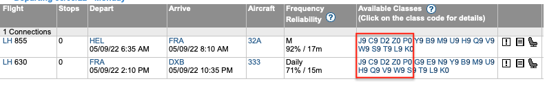 Sucht man nun aber den Flug von Frankfurt nach Dubai alleine, findet man hier durchaus noch Business Class Sitze in der Buchungsklasse P.