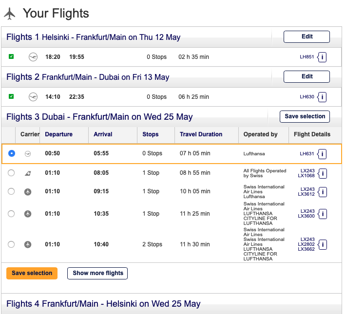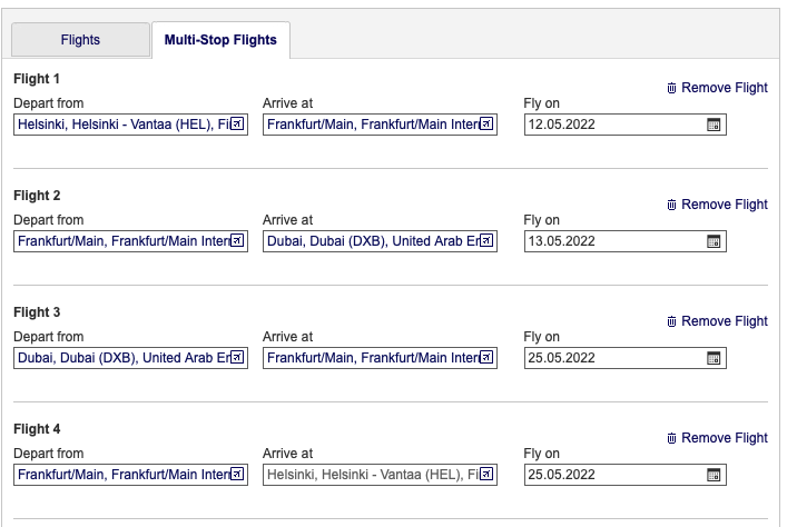 Hier kann ich nur vorgegebene Zeiten und Orte (HEL – FRA, FRA+MUC – DXB) auswählen.
