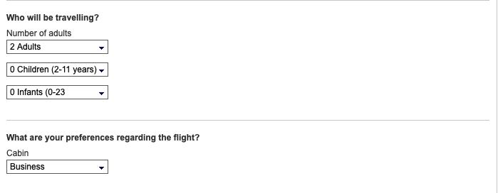Um nun die Webseite davon zu überzeugen, keine Married Segmente einzubuchen, müssen wir Flugpaare auswählen, welche man sonst wohl kaum zusammen buchen würde.