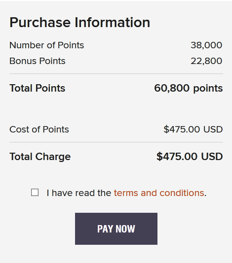 30. Juni 202015. Juli 2020 23:59 Eastern Time. - Normalerweise dürfen maximal 50.000 Punkte im Kalenderjahr gekauft werden. Im Rahmen der Promo steigt die Grenze jedoch auf 100.000 Punkte, d.h. dass man zweimal bis zu 50.000 Punkte kaufen darf. In einer Transaktion ist der Kauf von 100.000 Punkten nicht möglich. Zusammen mit den Gratispunkten kann man während der Aktion 160.000 Punkte je Account kaufen.