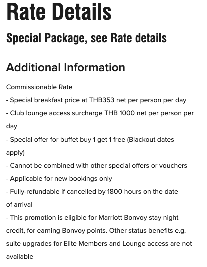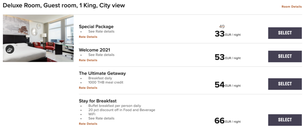 Konkret handelt es sich um das Marriott Sukhumvit, welches derzeit generell sehr günstige Raten bietet. Diese sind zunächst nach Standard-Tarifen und Sonderangeboten sortiert, die regulären Raten sind nicht betroffen.
