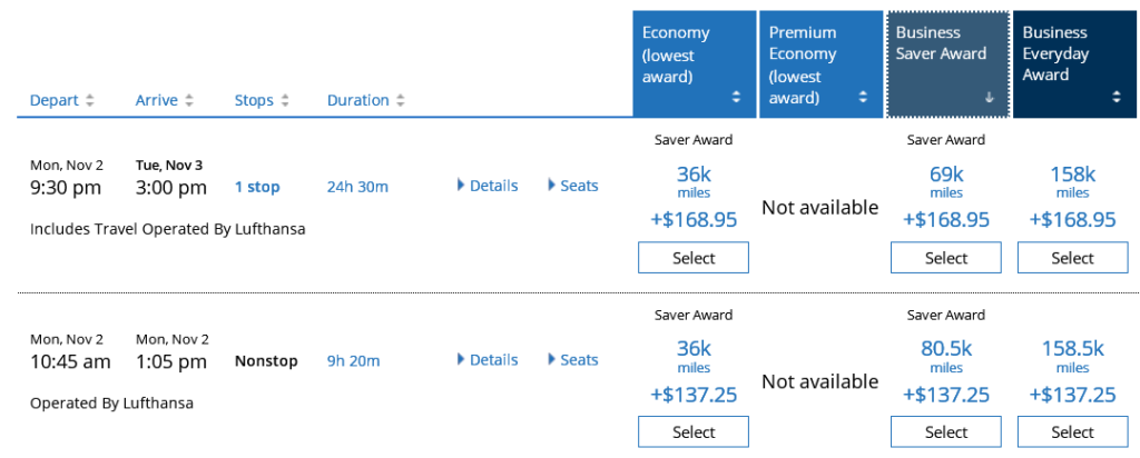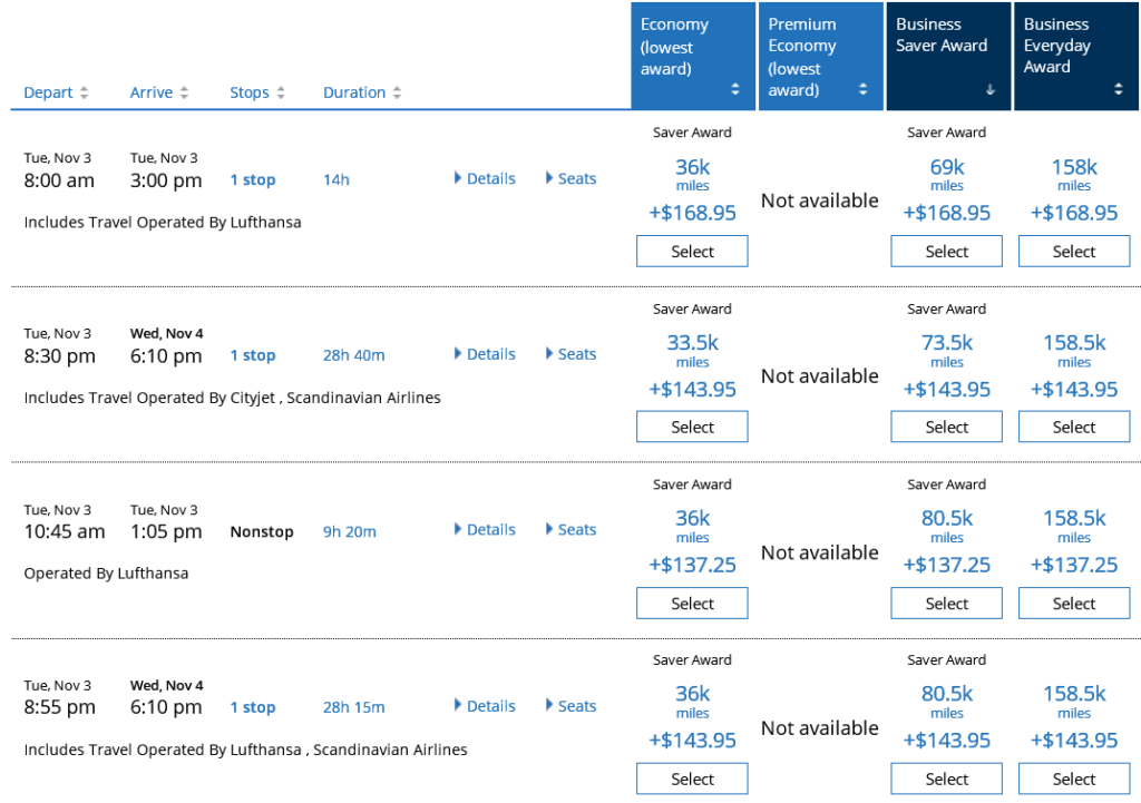 Hier wären wir in Europa maximal gebeutelt, denn United bietet keine Flüge nach Asien an und routet auch keine Meilentickets auf eigenen Flügen über die USA. Folglich sind wir auf Partnerflüge angewiesen.