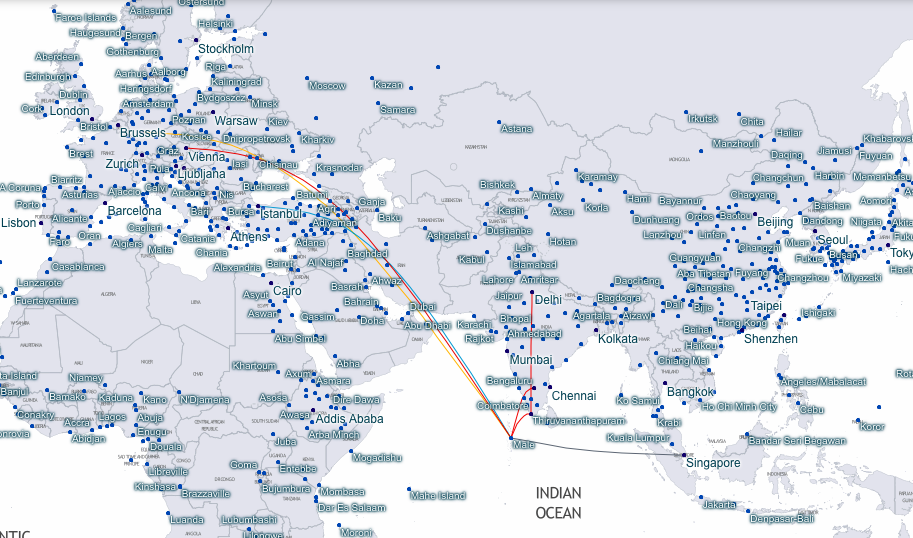 Wenn man sich die Star Alliance Streckennetz Karte anschaut, sieht man neben den Flügen aus Deutschland und Österreich noch Flüge mit Turkish Airlines über Istanbul und mit Air India über Bangalore und Thiruvananthapuram, sowie von Singapore Airlines ab Singapore.